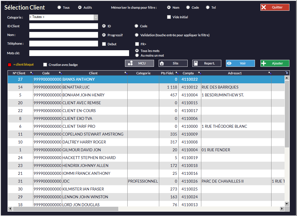 ouvre la fenêtre de recherche clients (qui apparaissent classés par ordre alphabétique) :