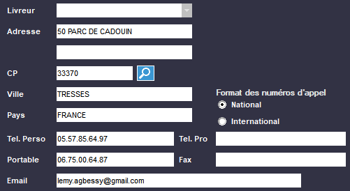 Cette zone permet de renseigner les données personnelles des clients. Vous pouvez choisir le livreur concerné par la ville. Format des numéros d'appel permet de saisir des numéros de téléphones étrangers (en choisissant International). La loupe permet de faire une recherche de ville en fonction du code postal. Normalement, lorsque vous tapez le code, une fenêtre s'ouvre pour vous proposer des villes qui pourraient correspondre. Cette fenêtre peut être désactivée en décochant la case Désactiver Recherche CP Fiche Client dans Fichier -> Paramètres -> Configuration -> Article. |