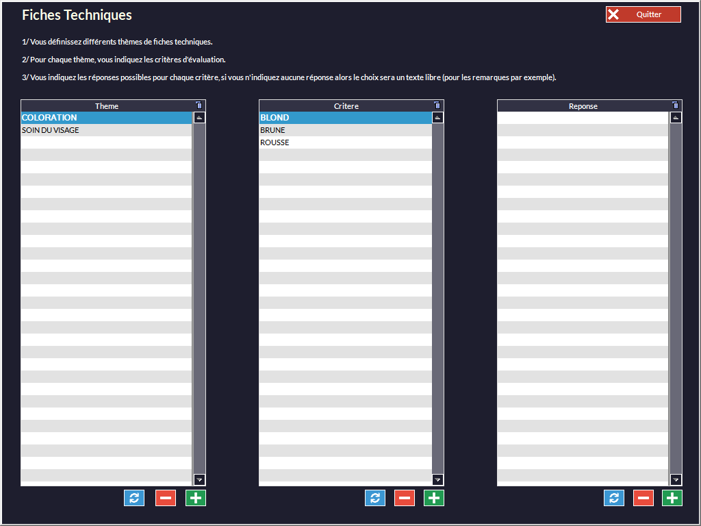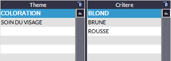 Un thème, c'est par exemple la coloration. Un critère, ça peut être blond et la réponse peut être "Coloration Blond HL41321".