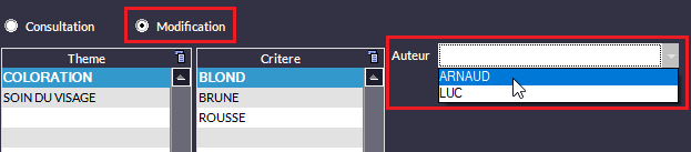 •Vous pouvez écrire les dosages dans la fenêtre Valeur. Dans notre exemple, choisissez le thème Coloration, le critère Blond et dans le champ valeur vous pouvez mettre les dosages précis pour être certain de faire la même couleur à la cliente en question, à chaque fois qu'elle viendra.