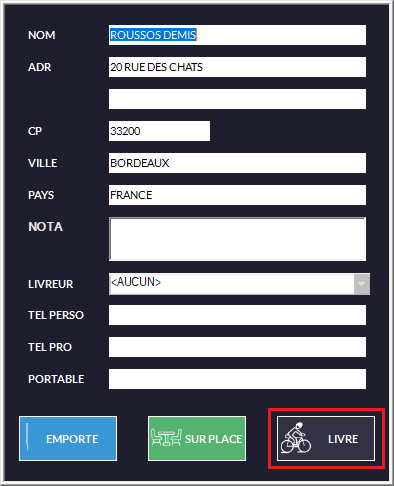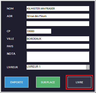 •Sélection du livreur en Vente & Cde : lors d'une vente ou d'une commande en caisse, le logiciel vous demandera de choisir le livreur (si vous choisissez Livre). Il faut activer l'option Sur Place / Emporté dans les Options Articles (Fichier -> Paramètres -> Configuration -> Article).