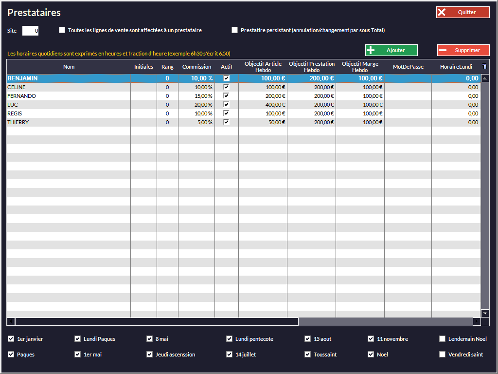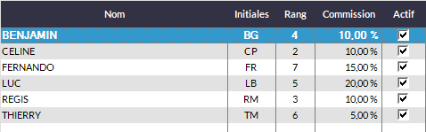 •Entrez ses initiales directement dans le tableau (utile car elles s'afficheront sur les lignes du ticket de caisse, à côté de la prestation). Sinon, le prénom s'affichera après la ligne article.
