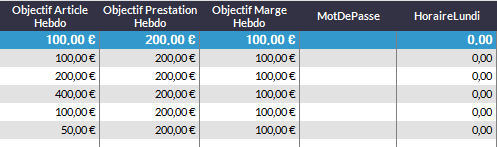 •Vous pouvez définir des objectifs hebdomadaires visant les articles, les prestations ou la marge.