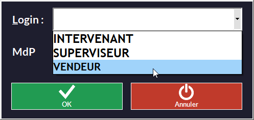 Les profils Superviseur et Intervenant sont présents par défaut. Ici, nous avons ajouté Vendeur. Pour Superviseur et Intervenant (des profils qui ont accès à tout le logiciel) un mot de passe est obligatoire. Pour les vendeurs, c'est facultatif. Notez bien que les noms "Vendeur" ou "Superviseur" peuvent être changés et que l'on peut ajouter plusieurs autres profils.