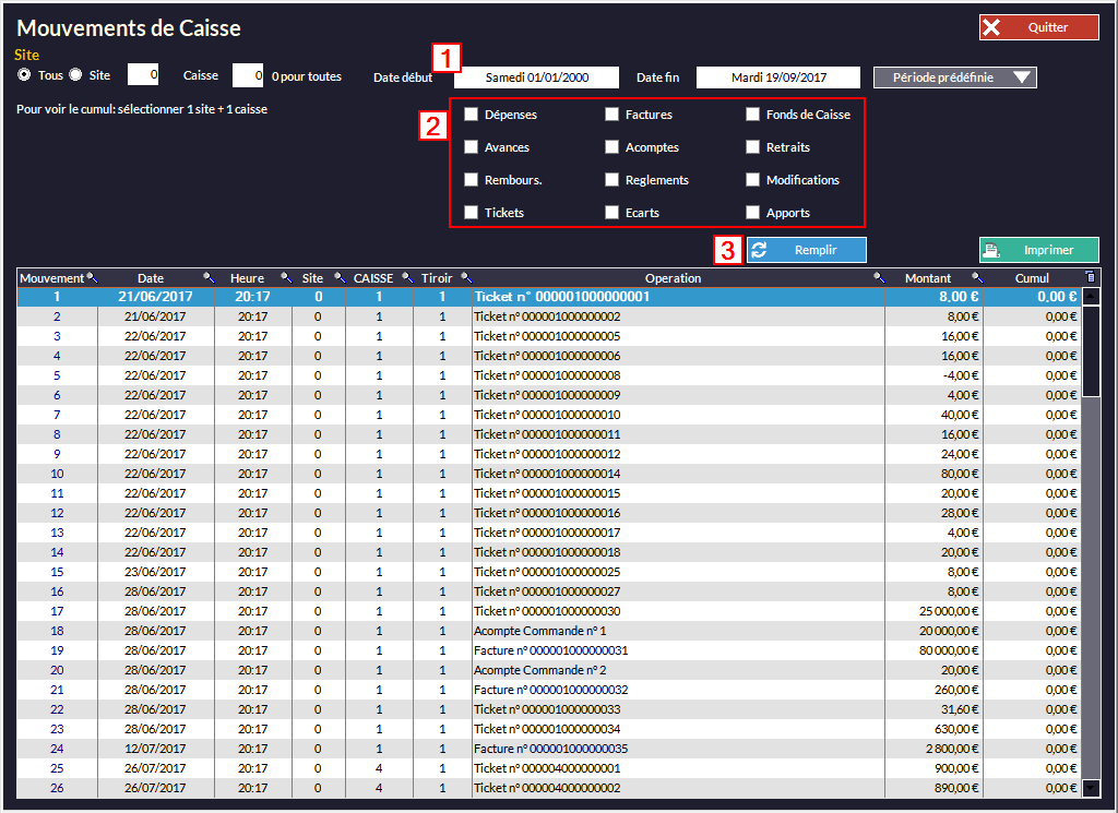 Vous pouvez choisir le site et le numéro de caisse pour affiner les résultats.