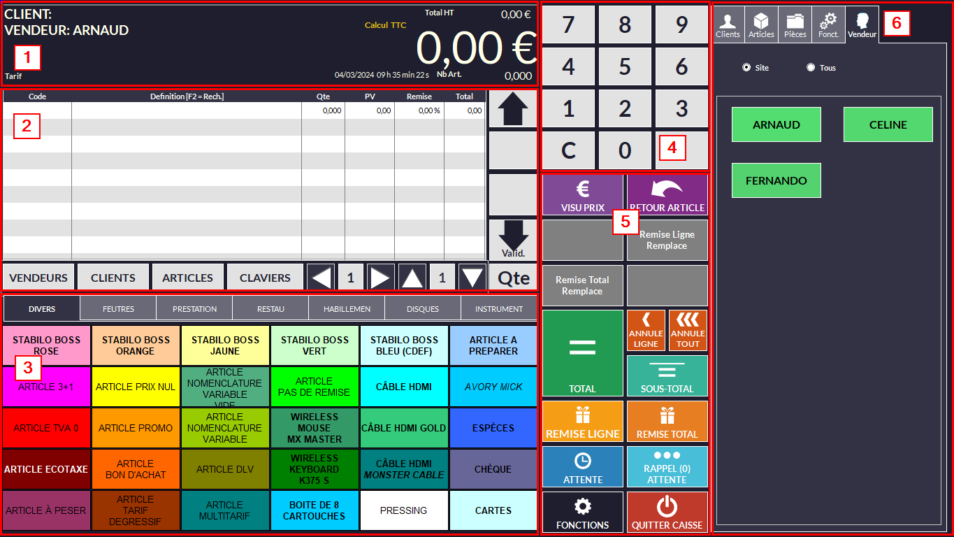 C'est la zone où vont s'afficher des information telles que le prix de vente, le nom du client, l'heure, etc.