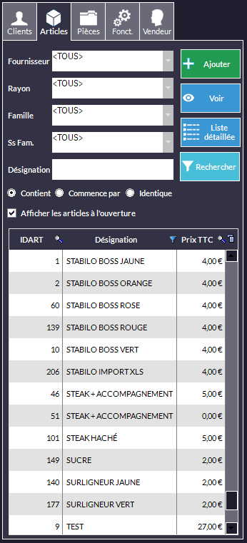 Ce sont les lignes du ticket de caisse qui vont s'afficher ici (nom de l'article, quantité, prix, remise éventuelle et total de la ligne (Quantité x Prix de Vente)). On peut aussi sélectionner un client, des articles ou accéder aux menus/volets grâce aux trois boutons Clients, Articles et Claviers. Il est tout de même conseillé dans cette interface de masquer ces boutons [option Étendre la table Article) car ils sont déjà accessibles via les onglets. |