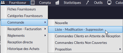 La gestion de commandes fournisseurs peut être réalisée à partir de la liste de commandes. Vous pourrez en créer de nouvelles, les modifier ou les annuler.