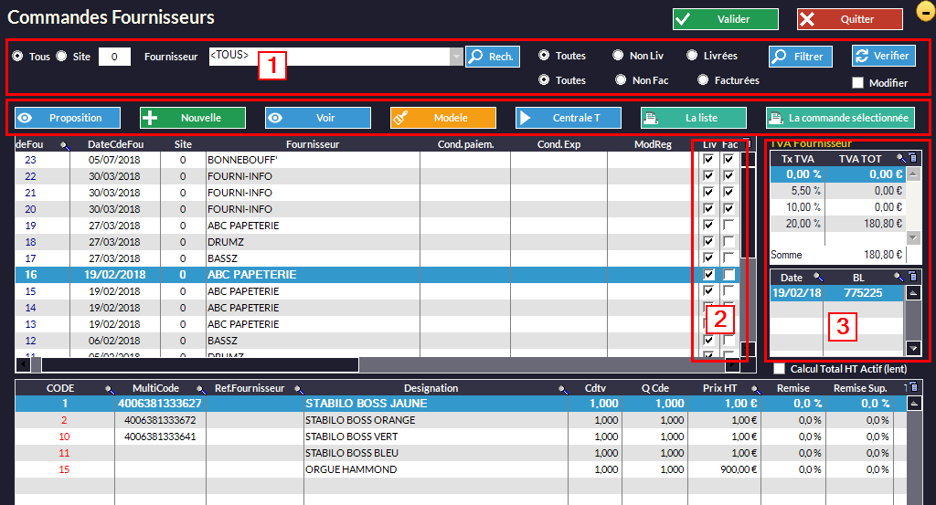 pour valider : n'apparaissent que les commandes du fournisseur sélectionné. Vous pouvez également filtrer les commandes livrées ou non, facturées ou non.