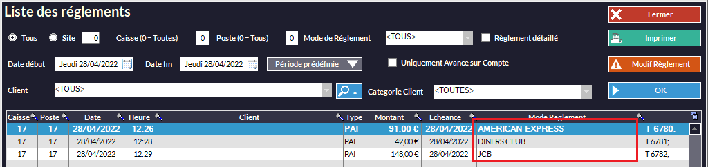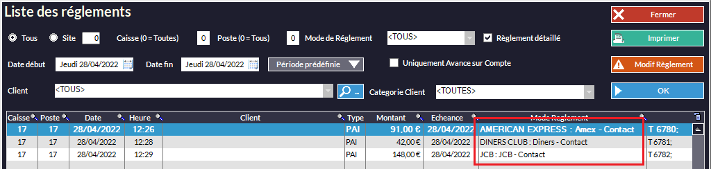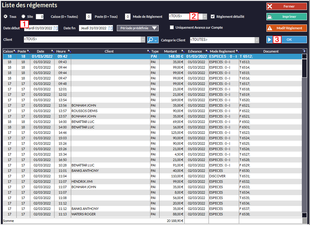 Cliquez sur le sélecteur Mode de Règlement pour choisir celui que vous voulez afficher (dans notre exemple, Tous est sélectionné)