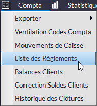Cet outil liste tous les règlements réalisés sur une période donnée. Il peuvent être triés et sélectionnés à l'aide des filtres proposés.