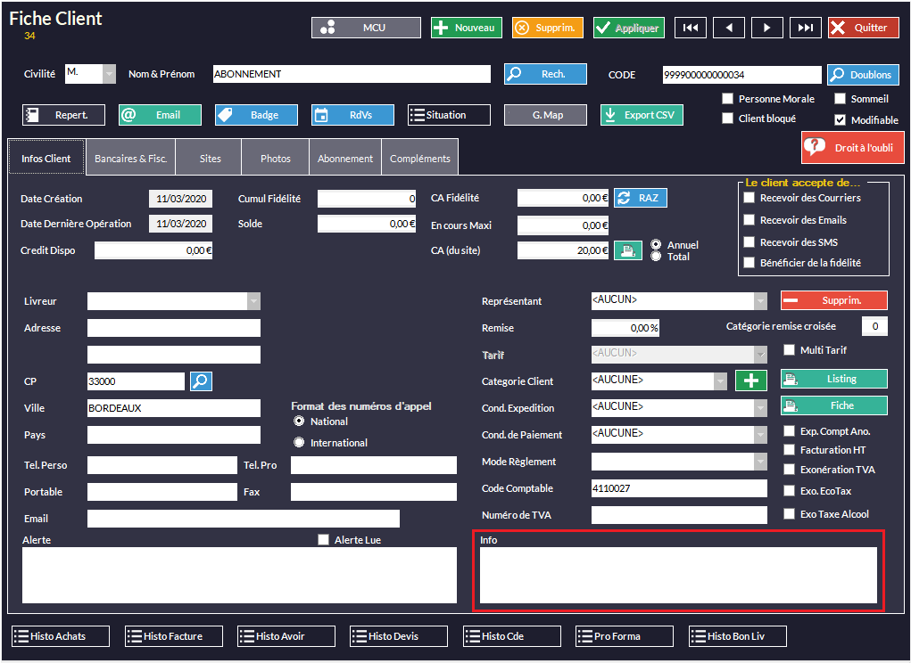 Permet de trier le listing par catégorie client (voir Gestion des clients - Fonctions avancées) avec ou sans e-mail. Mots clés permet d'effectuer une recherche sur le champ Info de la fiche client 🡇 |