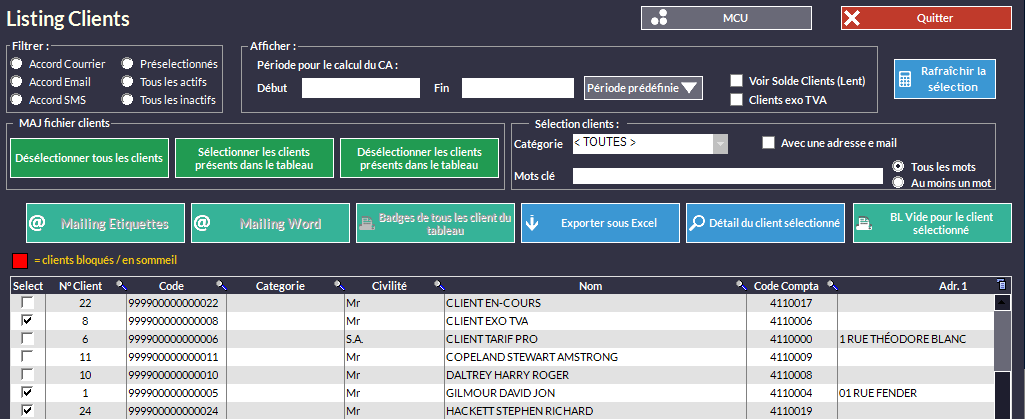 n'affiche que les clients ayant une adresse e-mail renseignée dans leurs fiches. Peut se cumuler avec le choix d'une catégorie.