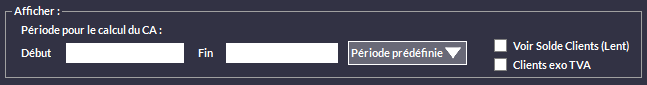 Permet de définir une période d'analyse du chiffre d'affaires des clients. On peut ajouter au tableau une colonne affichant le solde de chaque client. Il est possible de filtrer les clients exonérés de TVA (voir plus bas). Pour valider ces paramètres et mettre à jour le tableau, appuyez sur |