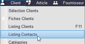 Cette fonction permet de lister tous les contacts créés dans les fiches clients (onglet Sites, tableau de droite, colonne Nom du contact). Pour plus de précisions, voir Gestion des Clients - Création d'un Client.