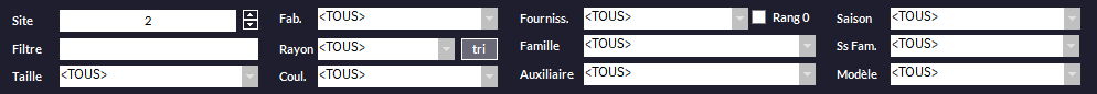 •Aux. : quand on est en gestion des modèle/tailles/coloris, la colonne indique l’auxiliaire (qui est un champ permettant d'entrer - si besoin est - un critère en plus de modèle, taille et coloris) de l'article.