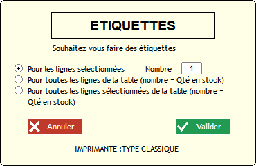 Ouvre une fenêtre vous permettant d'imprimer des étiquettes selon plusieurs choix :