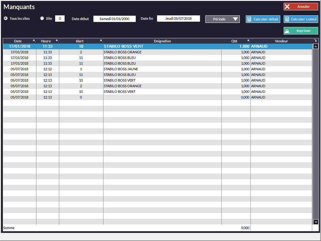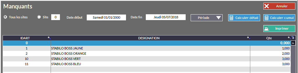 L'outil permet de lister les manquants (généralement utilisé pour affiner les commandes fournisseurs). Vous avez ici une liste de ces articles déclarés manquants dans la période que vous avez définie.
