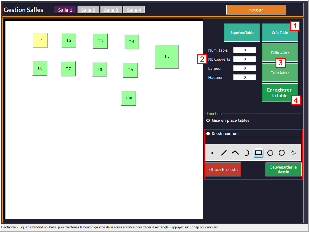 Les outils de dessin vous permettent de reproduire avec plus de fidélité l'agencement de votre salle et la forme des tables.