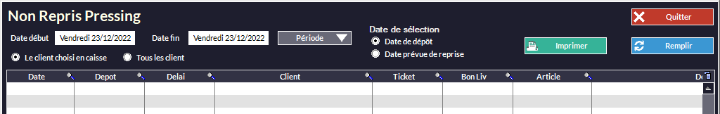 affiche une fenêtre qui vous permet de visualiser tous les articles à la date de dépôt ou à la date de restitution prévue (le délai entré au moment de la prise en charge) sur une période donnée.