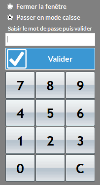 Le paramétrage des touches se fait en quittant le module Self (clic en haut à droite de l’écran) avec le code pour revenir au mode caisse habituel (option Passer en mode Caisse). La fenêtre peut être obtenue en cliquant (ou en touchant) sur le coin supérieur droit de l’écran.