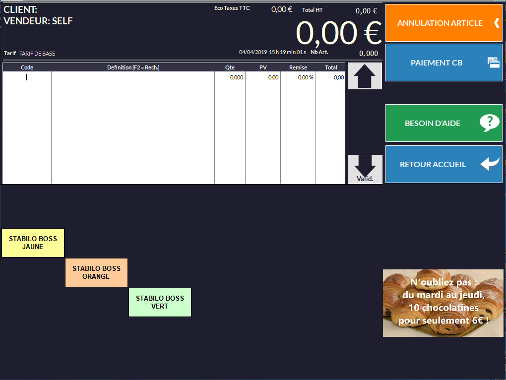 Il est toujours possible de combiner le tactile et la douchette (si un client prenait un article n’étant pas sur les touches par exemple…). Adaptez le message d’accueil en conséquence.