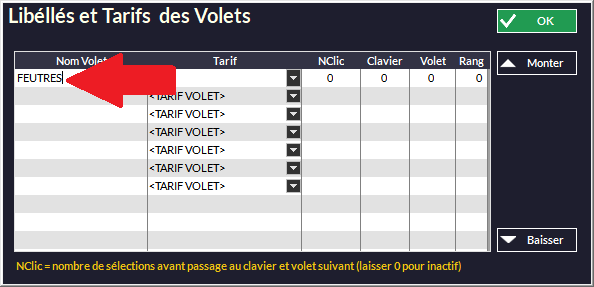 Inscrivez le nom du volet en cliquant directement dans le tableau :