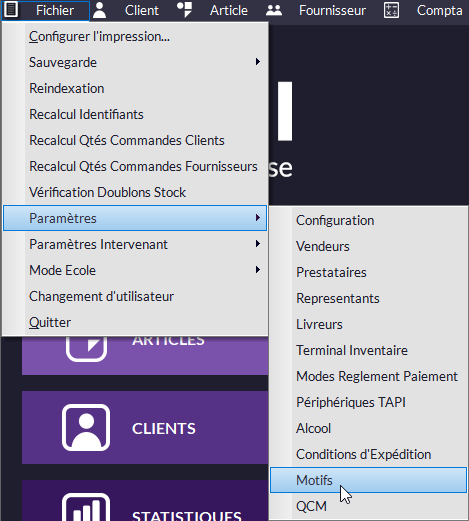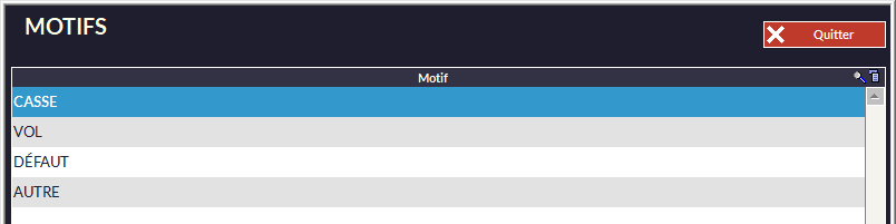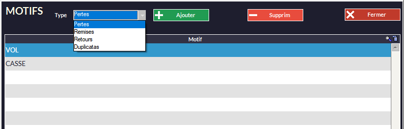 Les motifs sont utilisés lors de certaines opérations de caisse ; ils permettent de qualifier les raisons des mouvements Pertes, Remises et Retours.