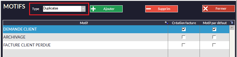 •Sélectionnez le Type de motif à créer (respectivement pour Pertes, Remises, Retours ou Duplicatas).