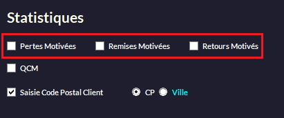 ☝Vous devez au préalable activer les différents motifs dans la fenêtre de paramètres d'articles. Pour ce faire, cliquez sur le menu Fichier -> Paramètres -> Configuration -> Clients / Options Métiers / Fournisseurs puis cochez les options suivantes :