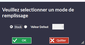 oVous pouvez sélectionner un rayon/famille... et cliquer sur Remplir. Une question vous sera posée pour savoir si vous remplissez la colonne Qté Mouv à zéro ou avec la valeur de stock actuelle :