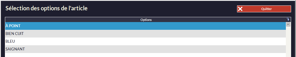 Dans cette fenêtre, vous pouvez créer des options à ajouter à vos articles lors de la vente en caisse. Par exemple, vous pouvez imprimer sur un ticket de préparation la cuisson des viandes (Bleu, Saignant, À Point, Bien Cuit) ou bien des suppléments de menus (sauce, frites, chantilly...)