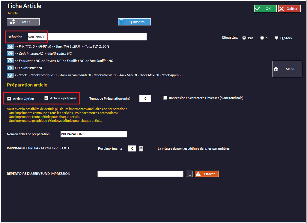 oCochez également la case Article à préparer pour le voir imprimé sur le ticket de préparation (en cuisine par exemple - voir le chapitre Préparation plus haut dans ce manuel). Rattachez éventuellement l'article à un rayon.