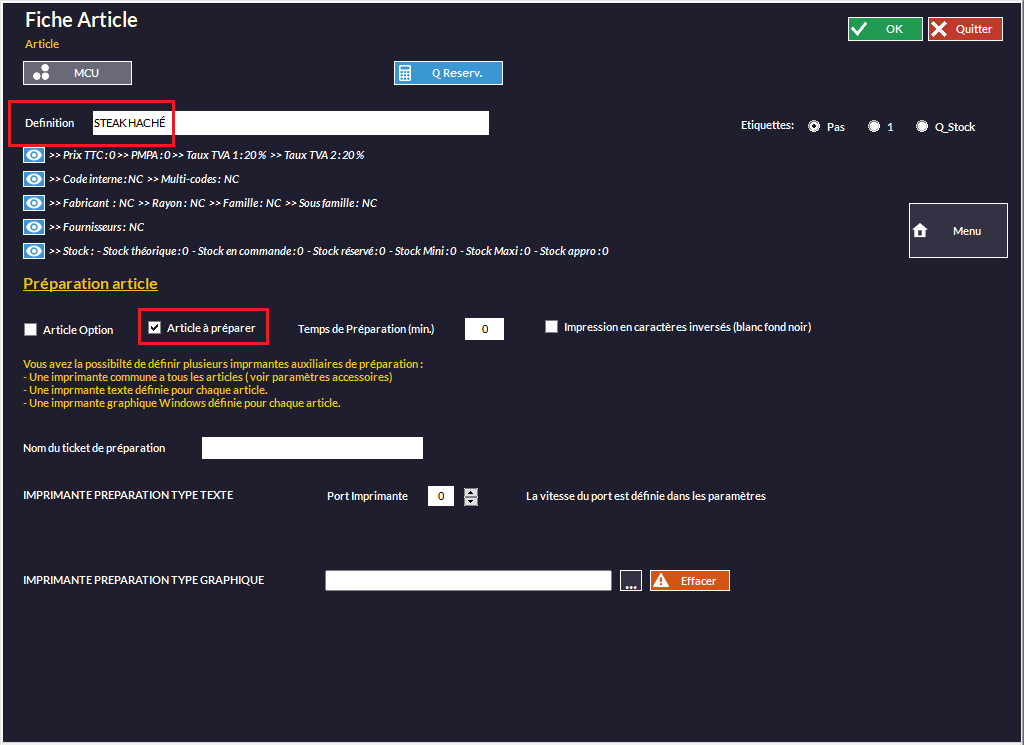 •Créez maintenant l'article principal (Steak Haché dans notre exemple) et cochez l'option Article à Préparer dans dans