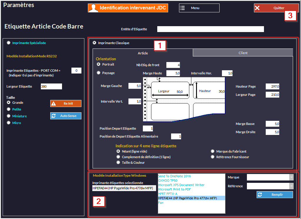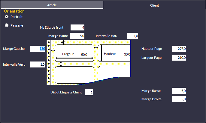 Dans cette fenêtre vous pouvez gérer le format des étiquettes paramétrables. Une fois la configuration réalisée, vous pourrez les imprimer à partir de la fiche Article ou à l'aide du chapitre suivant (Impression).