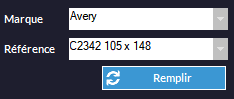 oSi vous connaissez la marque et le modèle de vos étiquettes, vous pouvez remplir leurs dimensions automatiquement. Choisissez Marque, Référence puis appuyez sur Remplir. Par exemple :