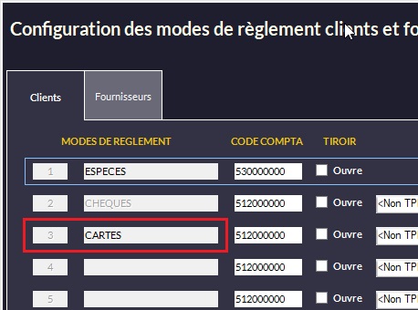 ☝Il est conseillé d'utiliser le mode de règlement CARTES (IDMod_Reg 3) installé par défaut dans le logiciel pour tout paiement par carte.