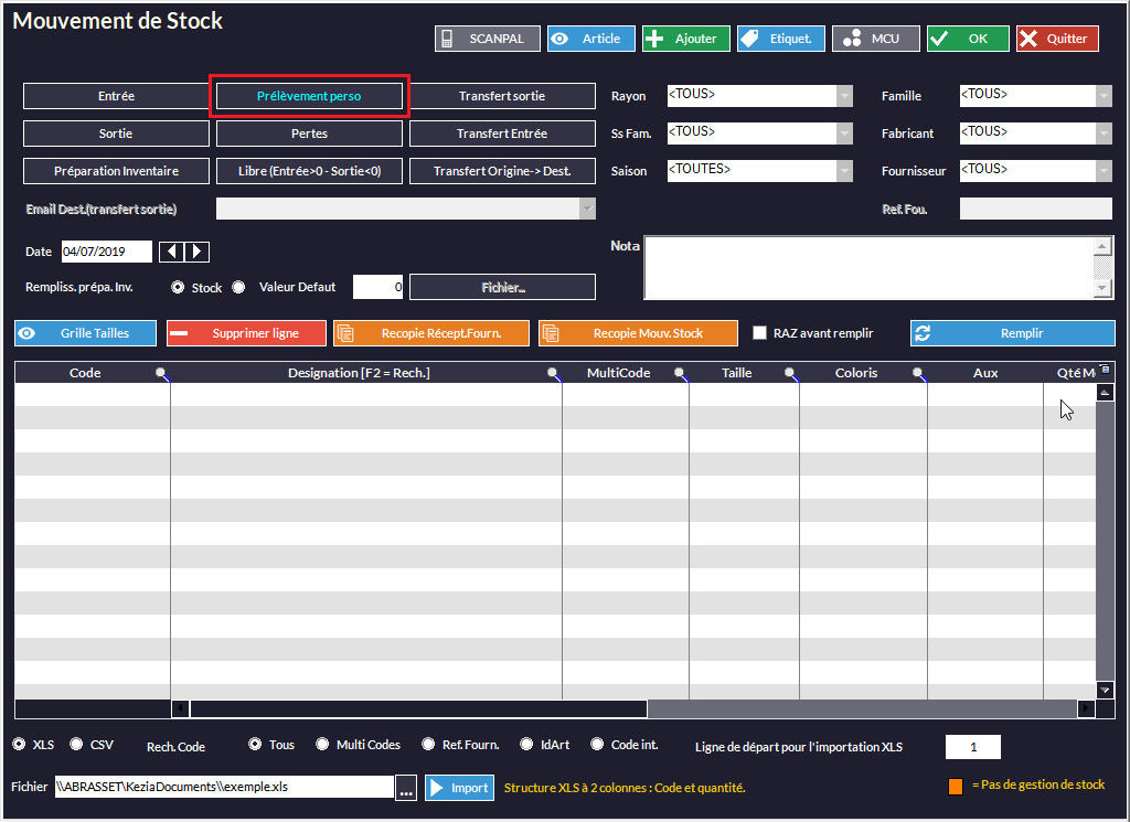 oVous pouvez importer un fichier Excel dont la structure comporte deux colonnes : code et quantité.
