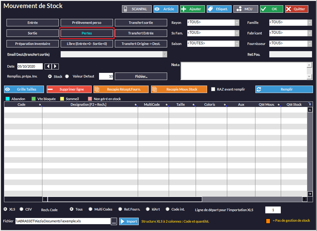 Permet de saisir des pertes (objets volés, cassés, abîmés ou périmés...) et des prélèvements perso se traduisant par un mouvement de sortie du stock.