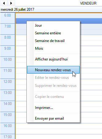 •Vous pouvez poser des rendez-vous en cliquant (clic gauche) dans la zone horaire qui vous intéresse (la zone va se colorer) et en faisant un clic droit dans cette même zone pour choisir Nouveau Rendez-Vous dans le menu contextuel qui va s'afficher :