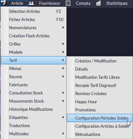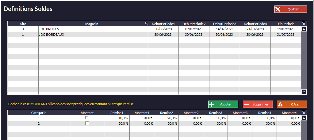 --> Cela vous permet de mettre en place différentes combinaisons de dates, de pourcentages et de prix soldés (montants) de réductions pour chaque rayon ou selon les produits...