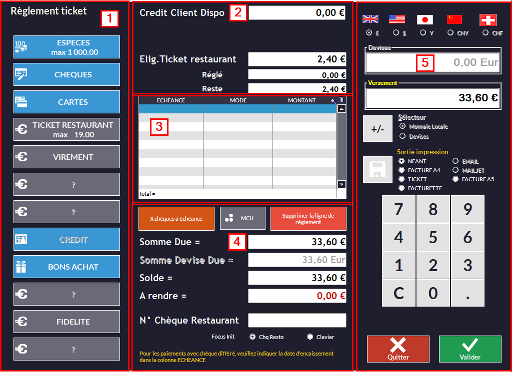 Ce sont tous les boutons se rapportant aux modes de règlements. Nous avons par défaut : espèces, chèques, cartes, crédit et bon d'achat. Les touches ? sont personnalisables (voir Paramètres/Configuration - Modes Règlement Paiement) pour ajouter des modes de règlements propres à votre activité (virement ou American Express par exemple). Si vous avez activé les modes de règlements additionnels, vous aurez accès à plus de possibilités (voir le chapitre Paramètres/Configuration - Modes Règlement Paiement).