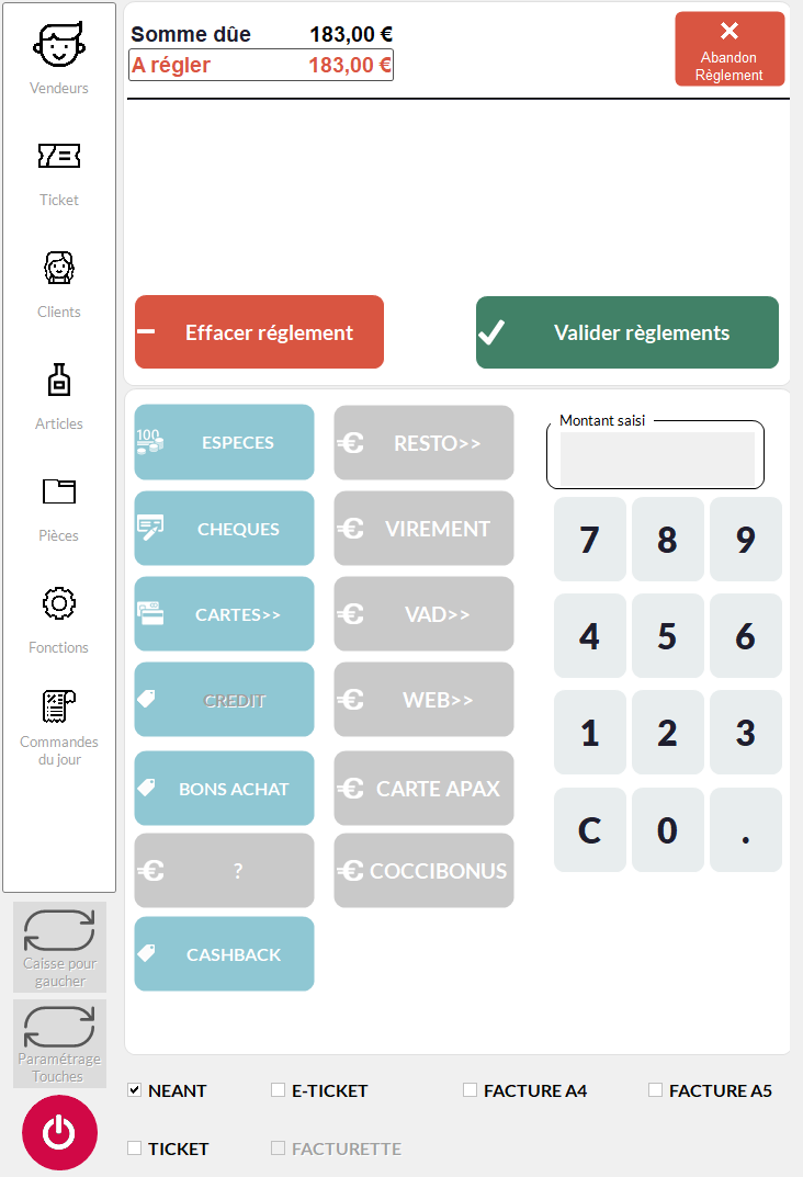 Si vous n'avez pas coché [Fichier -> Paramètres -> Configuration -> Saisie en Caisse rubrique Écran] Règlement depuis caisse 16/9, vous aurez la même fenêtre qu'au dessus qui apparaîtra. Sinon, vous aurez la partie droite qui passera en mode Règlement :