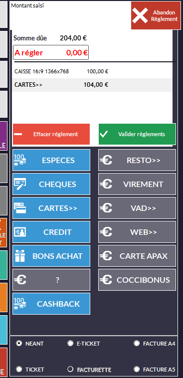 [Fichier -> Paramètres -> Configuration -> Saisie en Caisse rubrique Écran] Règlement depuis caisse 16/9 est automatiquement cochée. L'écran changera donc pour faire apparaître la partie règlement :