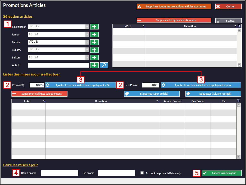 Commencez par créer la liste des articles concernés par la promotion. Pour ce faire, triez par fournisseur, un rayon et/ou tout autre critère de sélection. Cliquez à chaque fois sur le bouton