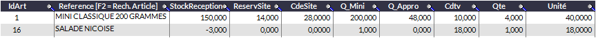 IdArt 1 : Le stock est de 150 unités, la quantité minimale est de 200. Le besoin serait de 50 unités. S’additionne à cette quantité les 14 en commande client moins les 28 en commande fournisseur soit un besoin de 36 unités. Étant donné que le cdtv est à 10, il sera proposé 40 unités (4x10).
