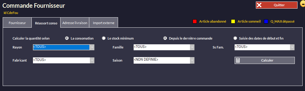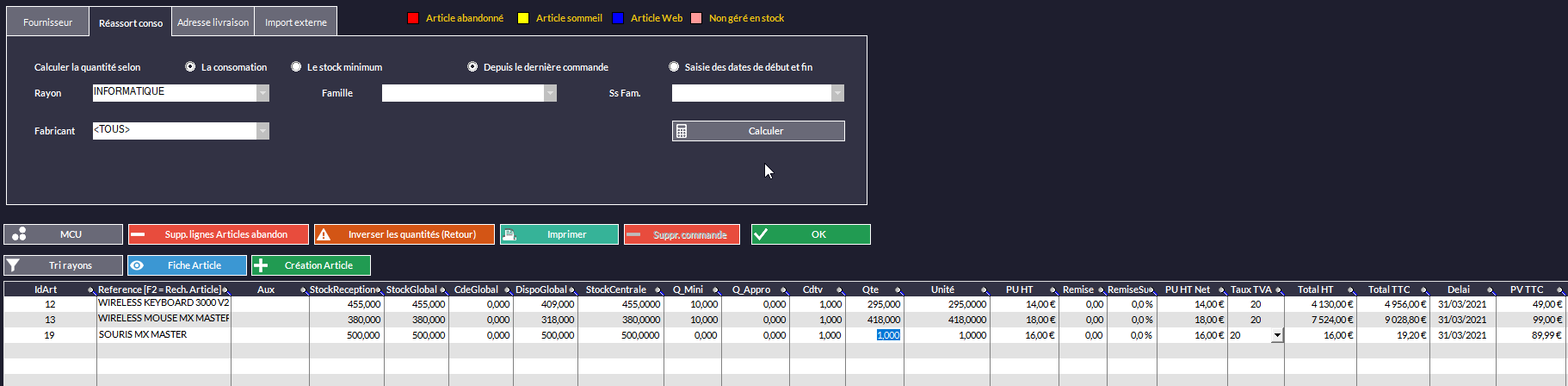 La quantité peut être calculée selon la consommation (le nombre de ventes) ou le stock minimum (saisi dans la fiche article si vous le gérez) le tout depuis la dernière commande ou en saisissant les dates qui vous arrangent.