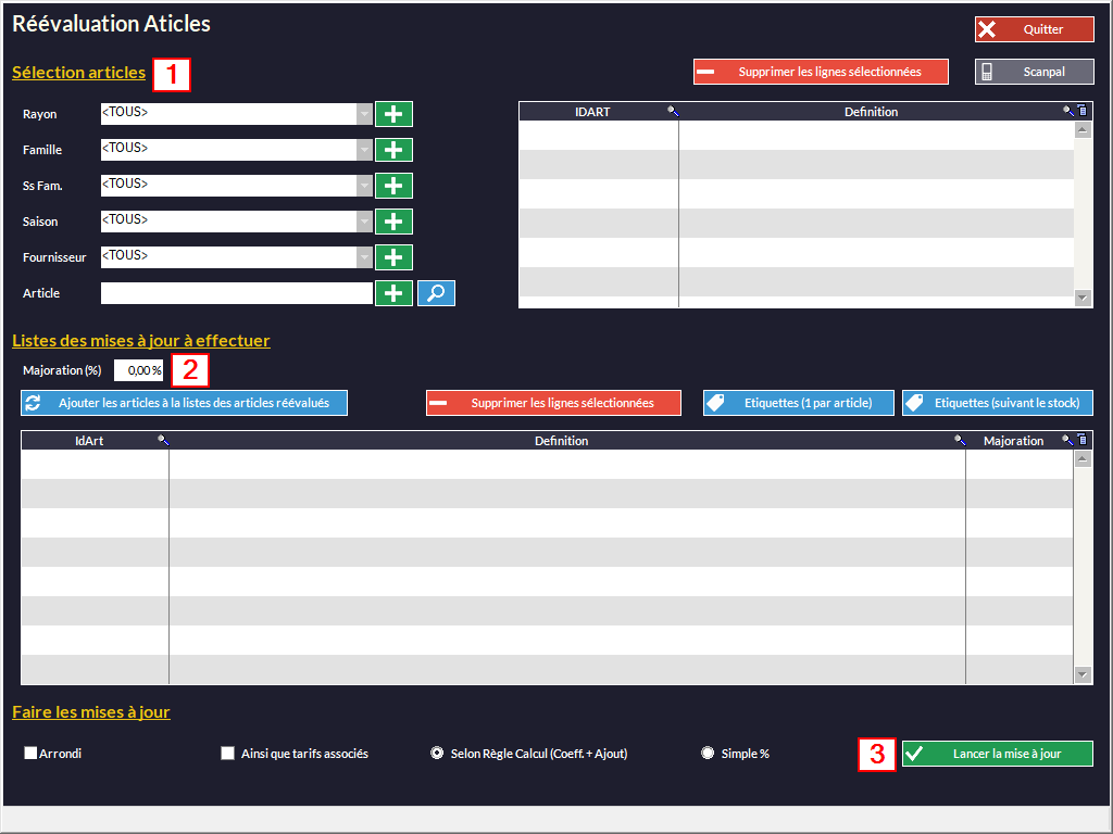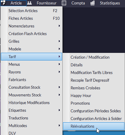Créez une liste d'articles à réévaluer à l'aide des filtres Fournisseur, Rayons, etc. Cliquez à chaque sélection sur