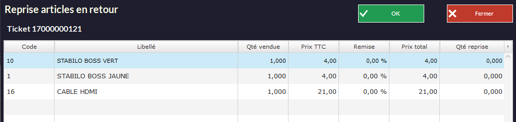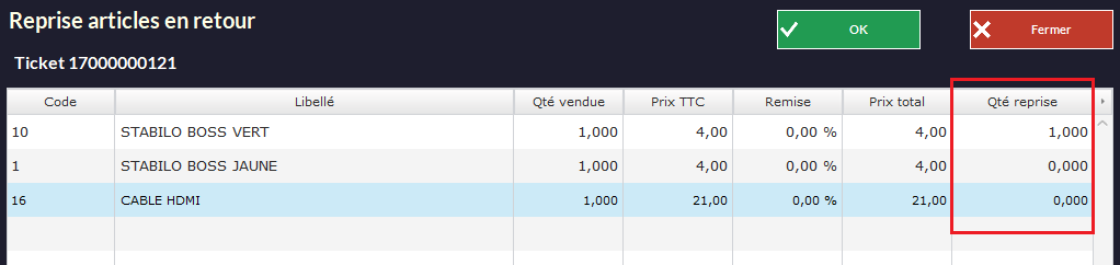 Un tableau s'ouvrira, listant les articles du ticket. Choisissez les articles que vous voulez reprendre en remplissant la colonne Qté Reprise :