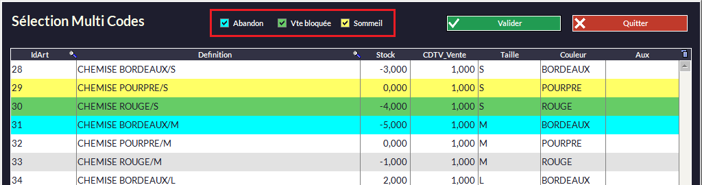Notez que vous pouvez filtrer les articles selon leur statut : Abandonné, Vente Bloquée et Sommeil.